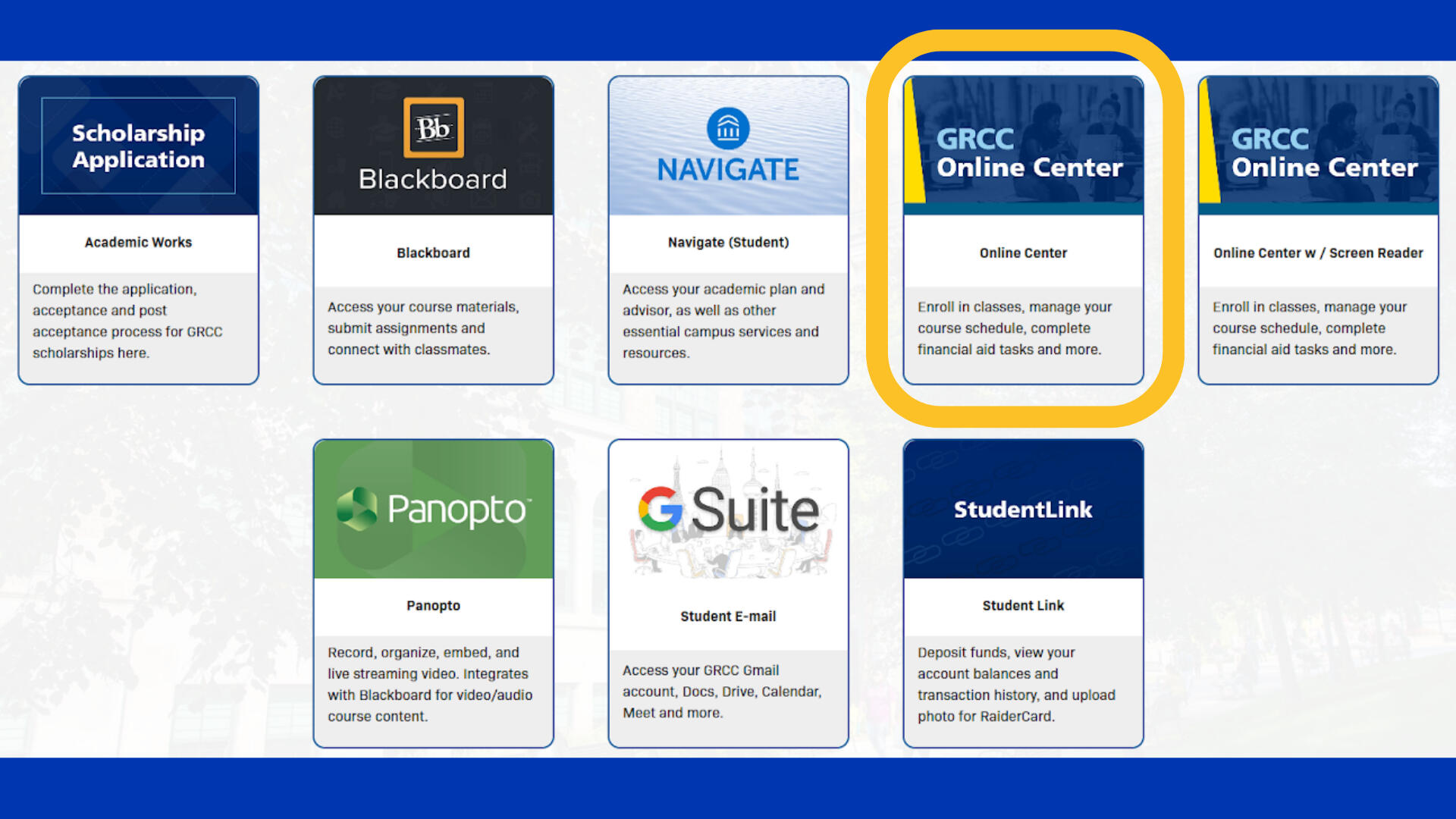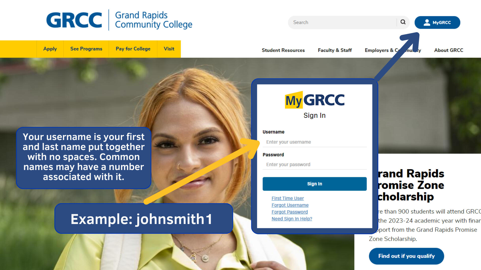Navigate to GRCC.EDU and log into your MyGRCC account. Your username will be your first name and last name together.If you forgot your login credentials, you can select "Forgot Username" or "Forgot Password".