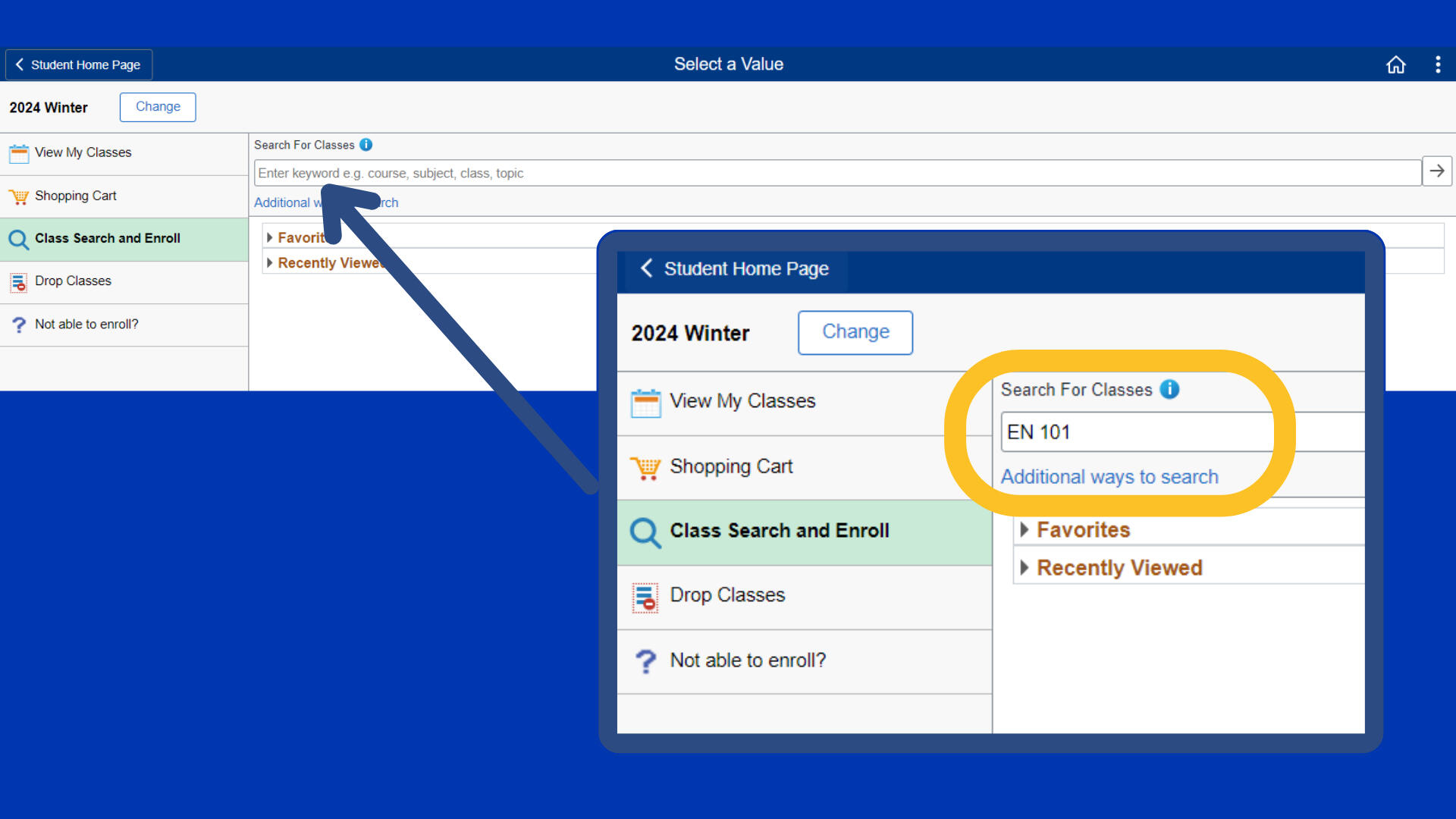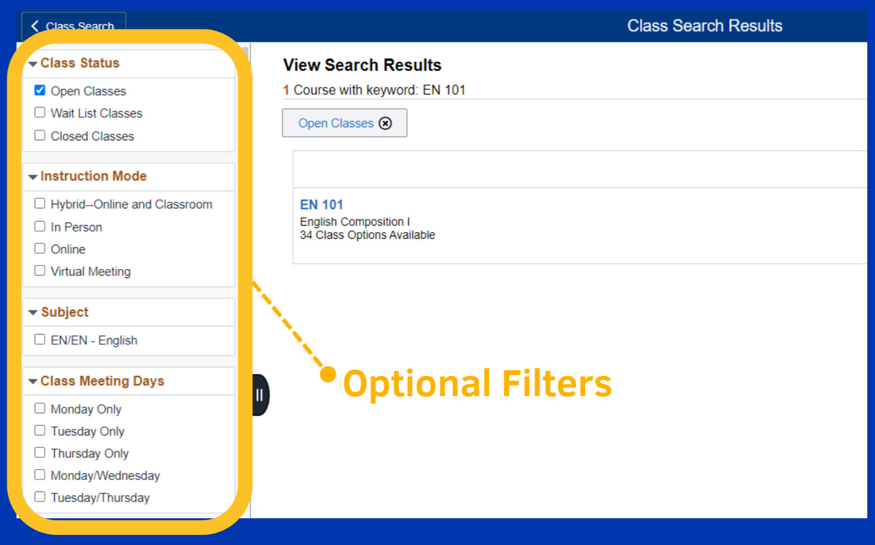 Search for your class using the format as shown below.For this example, we'll be using English 101, commonly referred to as EN 101.Include the space between EN and 101.