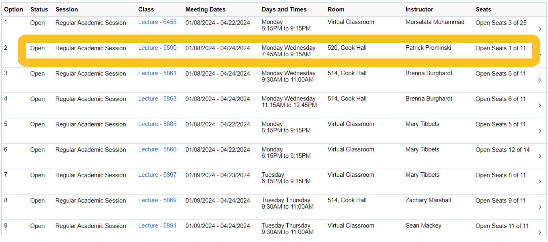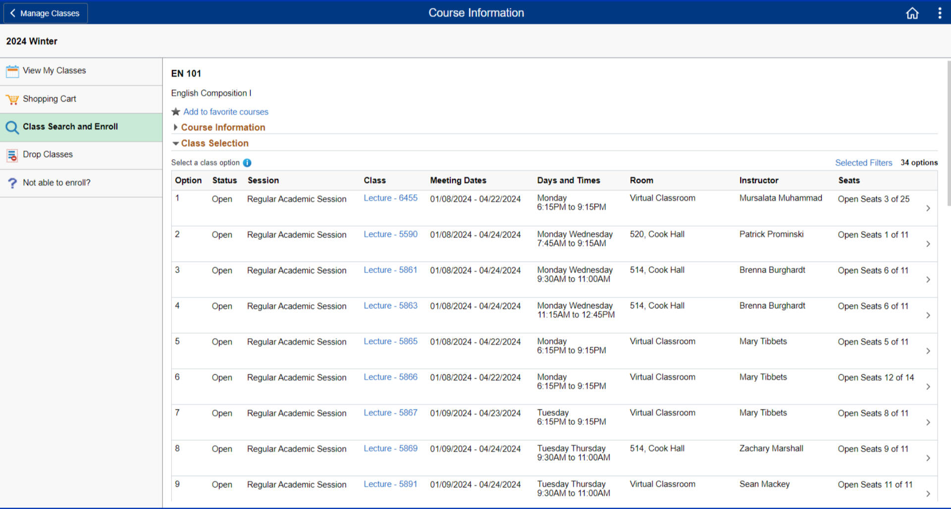 | 01/08/202X - 04/24/202X | Monday Wednesday 7:45AM to 9:15AM | 520, Cook Hall | John Smith | Open Seats 1 of 11 |